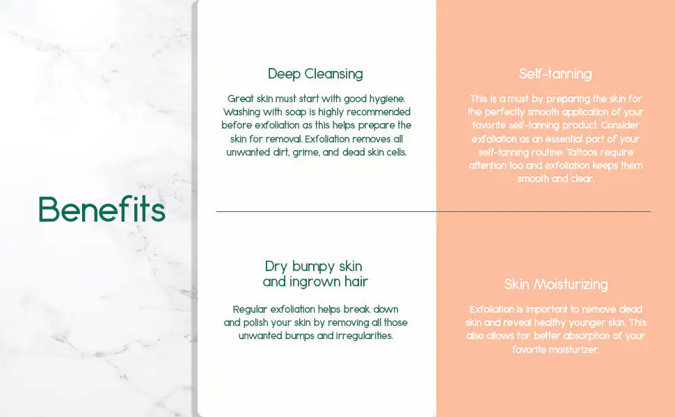 Skin Moisturizing. Exfoliation is essential to remove dead skin and reveal healthy younger skin. This also allows for better absorption of your favorite moisturizer.